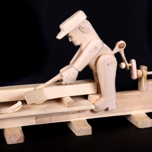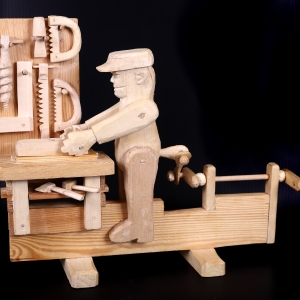- Stolarz heblujący deskę, rzeźba-zabawka ruchoma, wyk. Jan Puk