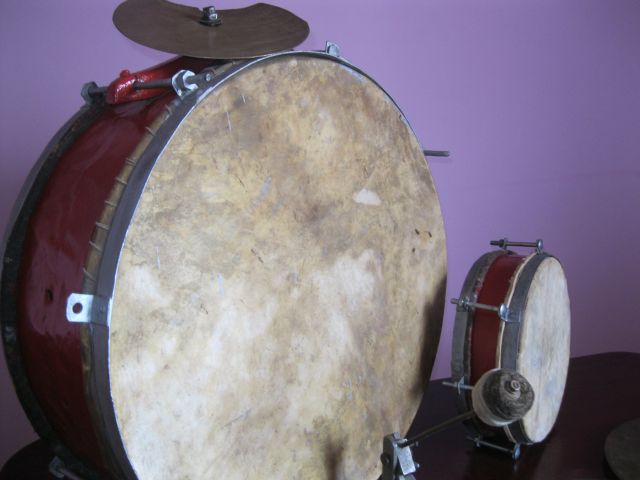 Wymiary bębna dużego: średnica membrany – 58 cm, szer. obręczy czerwonej- 22 cm, szer. metalowej obręczy – 2,5 cm, średnica czynela – 22,5 cm, średn. czynela z kapturkiem 31,0 cm, średn. czynela bez kapturka 32,0 cm. Spięty 8 śrubami, w tym 1 brak. Wymiary bębenka małego: średn. membrany – 28,0 cm, średn. obręczy – 10,0 cm, spięty 6 śrubami. Pałeczki oryginalne, po Franciszku, jedna długości 42,0 cm, druga- 38,0 cm.